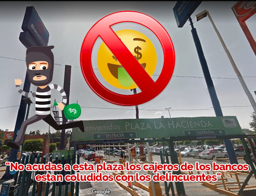 Como ya lo habiamos denunciado desde hace mucho tiempo en la zona de bancos ubicados en la “PLAZA LA HACIENDA” en Villas de la Hacienda, la cual esta ubicada en Blvd. Cuautitlán Izcalli Atizapán, Cd López Mateos, Estado de México, se han venido sucitado diferentes robos a cuentahabiente.