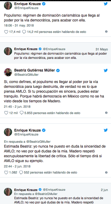Tras la respuesta de la esposa del candidato de la coalición Juntos Heremos Historia, Andrés Manuel López Obrador; el historiador contestó: “Estimada Beatriz: yo nunca he puesto en duda la sinceridad de AMLO; no veo por qué dudas de la mía. Madero respetó escrupulosamente la libertad de crítica. Sólo el tiempo dirá si AMLO sigue su ejemplo”.