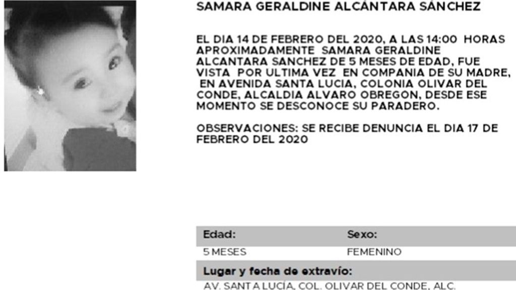 La Fiscalía de la Ciudad de México activó la Alerta Amber para localizar a Samara Geraldine Alcántara Sánchez de cinco meses de edad, fue vista por última vez en la alcaldía Álvaro Obregón
