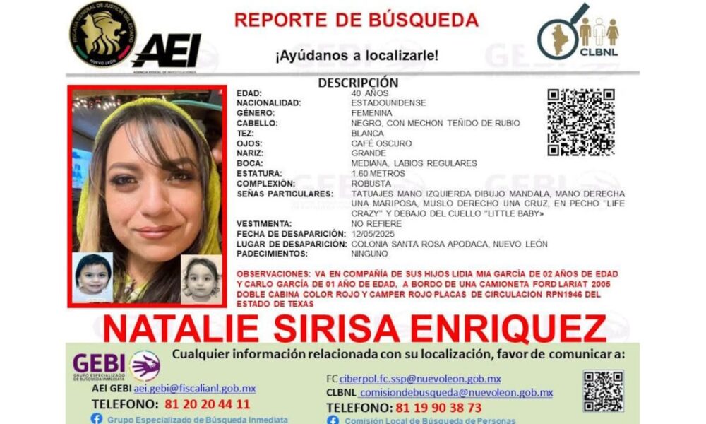 Autoridades de Nuevo León iniciaron una búsqueda urgente por Natalie Sirisa Enríquez, una mujer de nacionalidad estadounidense, y sus dos hijos pequeños, desaparecidos en el municipio de Apodaca, zona conurbada de Monterrey.