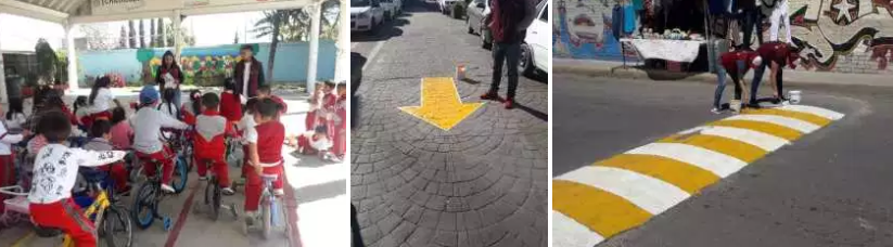 En el caso de los niños de preescolar de todos los niveles y los niños de primero, segundo y tercer grado de primaria, se han venido realizando unas sesiones prácticas con triciclos y bicicletas, en donde se hace la demostración de los accidentes que ocurren sino hacemos caso de los señalamientos como marcar el alto, para que sirven los colores del semáforo y comenzar a generar una cultura vial entre los niños.