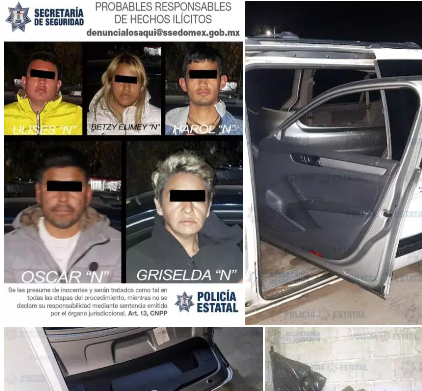 En coordinación con personal de la Fiscalía General de Justicia del Estado de México (FGJEM) se llevó a cabo el operativo, en el que se logró la aprehensión en flagrancia de los probables implicados identificados como Ulises “N”, de 21 años; Óscar “N” de 39 años; Harol Ara “N” de 21 años; Griselda “N” de 46 años y Betzy “N” de 23 años de edad, que fueron trasladados a la agencia del Ministerio Público con sede en Ecatepec, donde se inició la carpeta de investigación correspondiente para definir su situación jurídica.