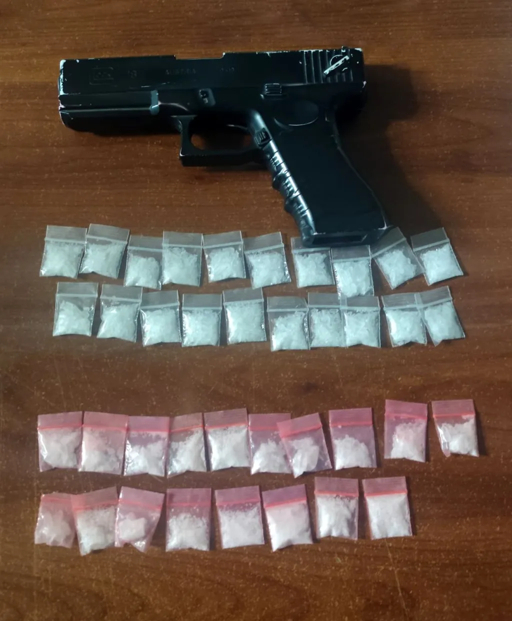 Al término, localizaron entre sus pertenencias, una réplica de arma de fuego, tipo Glock 18, con la leyenda Austria, además de 38 envoltorios de plástico que en su interior contenían una sustancia sólida cristalina con características similares a la droga conocida como cristal.