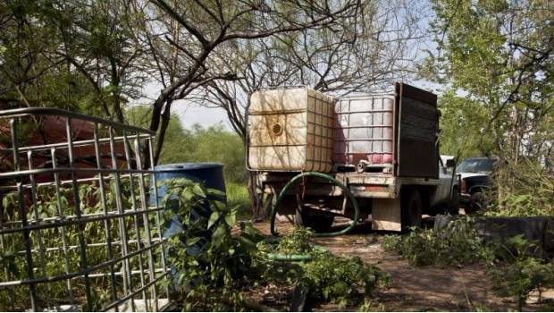 También resguardaba una camioneta de la marca Chevrolet, color blanca con verde de 3 1/2 toneladas, con placas de circulación KF57427, que transportaba cuatro contenedores con capacidad de mil litros cada uno, dos de ellos estaban llenos y dos vacíos.