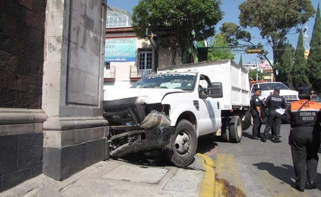 Luego de que se le votarán los frenos, una camioneta de recolección de basura del Ayuntamiento de Toluca terminó impactada contra el edificio de Palacio de Gobierno estatal, sin que hubiera lesionados.