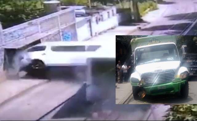 En éste se aprecia como un camión de Jarritos a exceso de velocidad impacta contra el transporte colectivo, que da un giro de 360 grados, choca contra una barda y vuelve al camino.