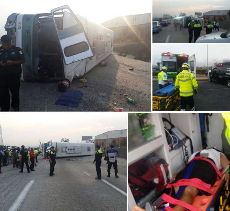 En La pendiente de la autopista México-Puebla, el autobús se quedó sin frenos, pero alcanzó llegar a la rampa de frenado ubicado en el kilómetro 38, en donde aunque logró para su carrera se volteó, dejando varias personas lesionadas, cinco de gravedad.