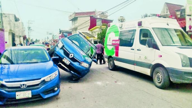 Luego de chocar, una camioneta conducida a exceso de velocidad quedó arriba de un auto compacto en calles del municipio de San Mateo Atenco. Derivado del accidente tuvieron que llegar paramédicos de Protección Civil para atender a las víctimas.