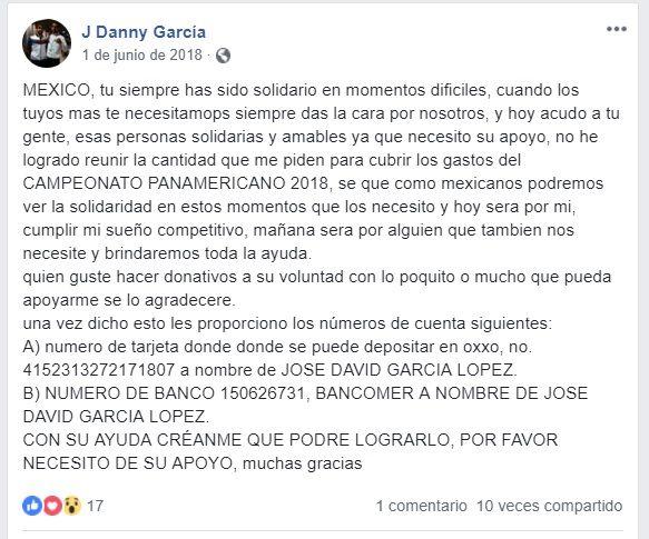 José Daniel García López solicitó la ayuda de la gente en atas de juntar recursos y así poder darse cita en dicha competencia.