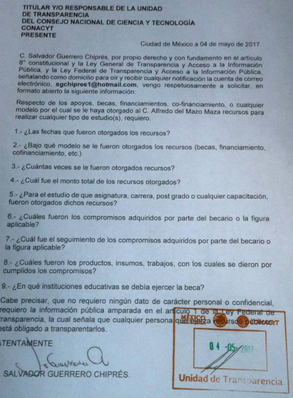 El ciudadano acudió esta mañana a la Unidad de Enlace del Conacyt a presentar una solicitud de información sobre los apoyos, becas, financiamientos o cualquier modo por el cual se hubieran otorgado recursos al candidato para realizar cualquier tipo de estudios. También hará lo propio en la oficina de Del Mazo para que aclare los cargos ilegales al erario.