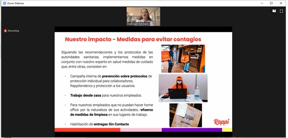 La directora global de Políticas Públicas y Relaciones con Gobierno de Rappi, Kathleen Mclnerney, explicó a la audiencia los beneficios de la aplicación en el contexto de la emergencia por COVID-19, en el que muchos establecimientos han tenido que cerrar o limitar sus operaciones.