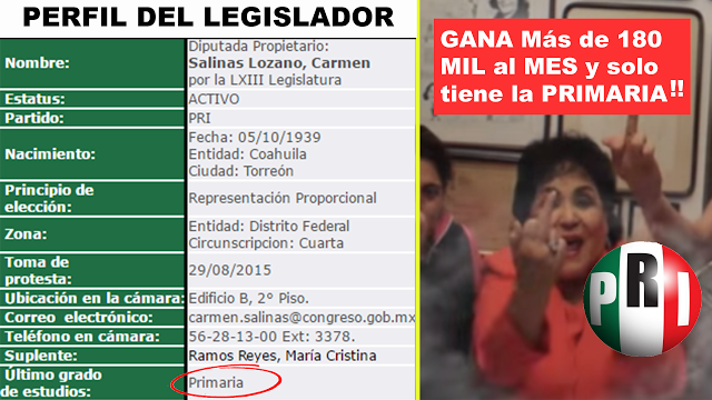 Sin hacer una Evaluación de conocimientos de leyes y política interna y externa la hayan nominado como diputada federal, sí aquí en México a los 45 años ya no te admiten para que trabajes en alguna empresa formal y cuando menos te piden un mínimo de estudios que sea Preparatoria Terminada, y ganando un poquito arriba del salario mínimo vigente, cuando está señora Carmen Salinas con tan sólo la primaria tiene un sueldo mensual de $180,000 pesos mensuales más su dieta y demás prestaciones.