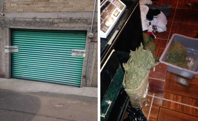 Con la información recabada, el Agente del Ministerio Público solicitó a un Juez Librar una orden de cateo para este inmueble. Una vez que la orden fue otorgada por la Autoridad Judicial, elementos de la FGJEM se trasladaron al sitio ubicado en la calle Josefa Ortiz de Domínguez, donde se localizó un paquete con cinta canela, que contenía hierba verde con las características de la marihuana, hierba verde en un recipiente, una báscula digital y bolsas de plástico, presuntamente utilizadas para empaquetar la marihuana.
