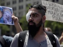 Una de las pancartas de los familiares y víctimas de daños oculares que han dejado las protestas en Chile y que se manifestaron el jueves frente al palacio presidencial …