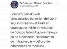 El prestigiado epidemiólogo, Francisco Moreno Sánchez aseguró la estrategia contra el COVID-19 no ha funcionado en México. En un tweet, publicó “Somos el país #16 en fallecimientos por millón …
