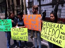 Con pancartas en mano y pegados a las vallas de seguridad, una docena de jóvenes de la comunidad retornada y de Otros Dreams en Acción (ODA) exigieron a López …