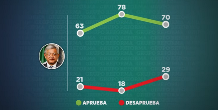 Este mes de julio la aprobación del presidente Andrés Manuel López Obrador fue de 70 por ciento, ocho puntos menos respecto a marzo, cuando logró el 78 por ciento, según una encuesta del diario Reforma.
