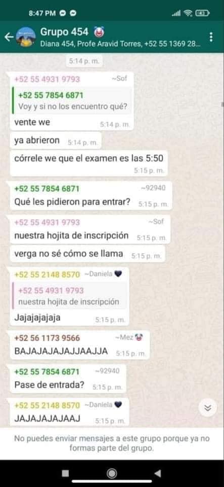 En las capturas de pantalla compartidas se puede observar cómo algunos miembros del Grupo 454 de Facebook, difundieron un mensaje en el que señalaban que se encontraban en la escuela para presentar un examen de geografía, incluso una de las alumnas subió imágenes para hacer creer que se encontraban en la biblioteca de la escuela.