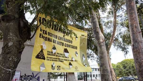 “¡Cuidado! Está usted entrando en zona de alto contagio”, advierte un letrero de un color amarillo chillón colgado por las autoridades y que desentona con el sosiego de este barrio rural de amplias fincas delimitadas por irregulares muros de piedra y de ladrillo.
