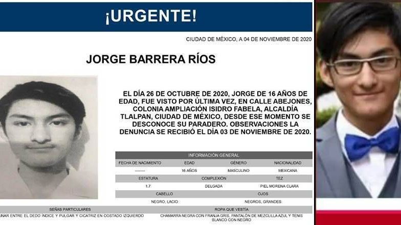 El miércoles se hizo tendencia el tema, con el “hashtag” “#nosfaltajorge” y la Fiscalía General de Justicia de la Ciudad de México (FGJ) difundió la ficha de búsqueda y la Alerta Amber por la desaparición de Jorge Ríos Barrera de 16 años, quien fue visto por última vez el pasado 26 de octubre.
