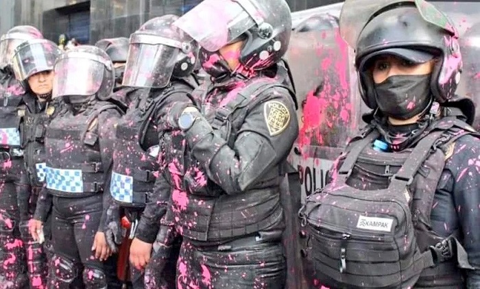 En un video que circula en redes sociales, y que se grabó en la avenida Juárez, junto a la entrada de la tienda Sears, se ve a mujeres policías con el uniforme todo manchado de rojo y rosa, esto debido a que las manifestantes feministas les aventaron pintura.