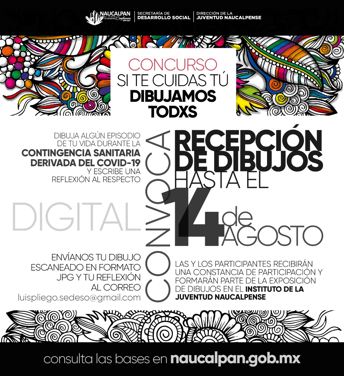 Si Te Cuidas Tú, Dibujamos Todxs es un concurso en el que se podrá enviar obra gráfica, acompañada de una reflexión, inspiradas en las experiencias personales durante la pandemia; la recepción estará abierta hasta el 14 de agosto, y las y los participantes recibirán una constancia de participación y formarán parte de la exposición de dibujos en el Instituto de la Juventud Naucalpense.