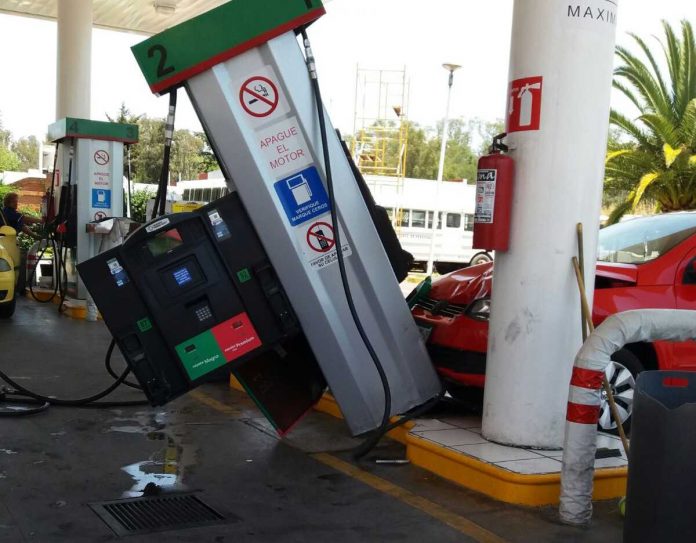 Un automovilista chocó contra una bomba despachadora de gasolina en en Av. Las Torres y Blvd. Nezahualcóyotl.