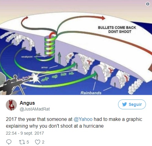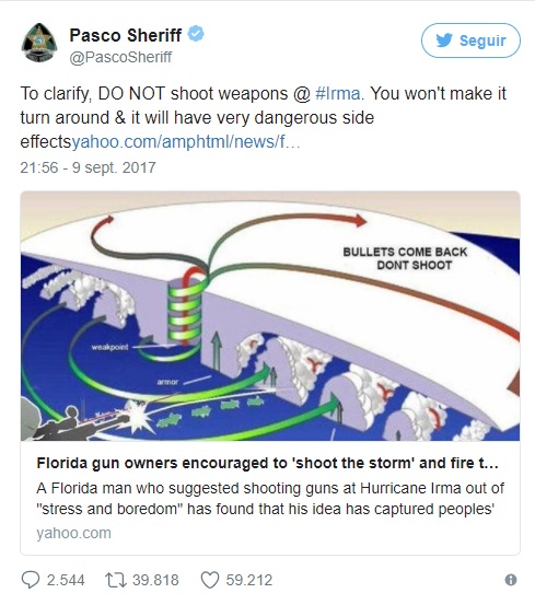 “Mostremos al huracán Irma que los primeros en disparar somos nosotros”. Esta es la consigna que lanzan a los residentes de Florida (EU) dos usuarios de Facebook que han creado en esta red social un evento titulado “Disparen contra Irma”, y que cuenta ya con más de 53.000 participantes.
