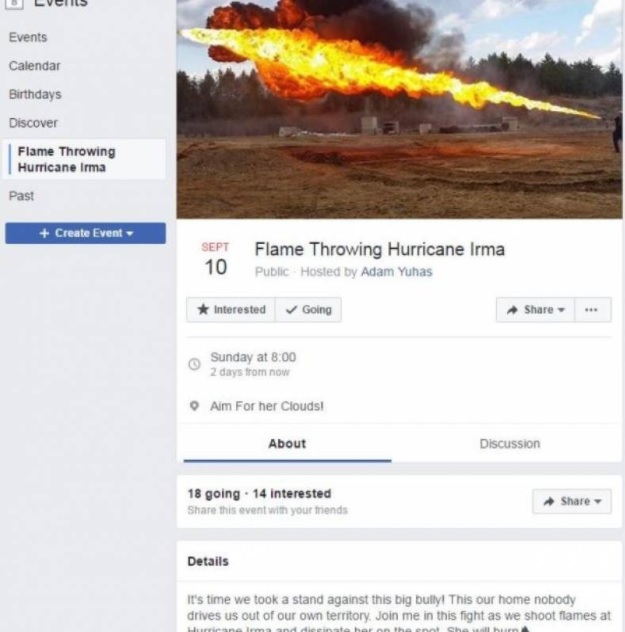 “No voy a quedarme sentado a esperar, le dispararé justo en el ojo”, ha prometido uno de los participantes del evento en un mensaje acompañado por una foto en la que aparece con una escopeta. “Huracán Irma piensa que está lista, pero yo lo dudo, carajo”, escribe otro usuario de Facebook, que también añadió al mensaje una foto suya con una pistola.