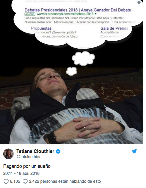 “Pagando por un sueño”, dice la publicación acompañada de dicha fotografía en la que el panista tiene un globo de pensamiento con una captura de pantalla de una búsqueda en Google sobre los debates presidenciales.