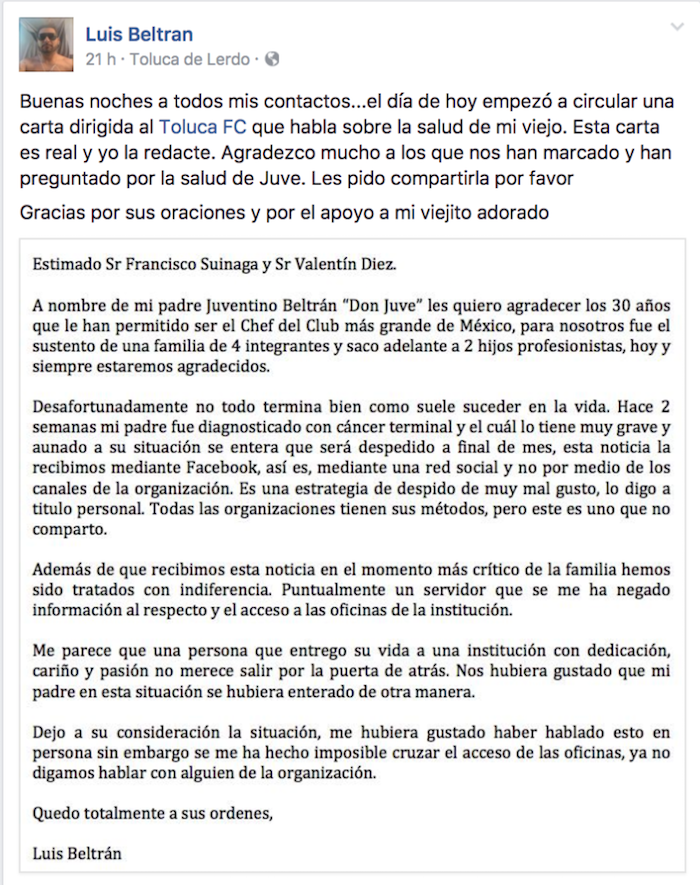 “Hace dos semanas mi padre fue diagnosticado con cáncer terminal y el cual lo tiene muy grave, y aunado a esa situación se entera que será despedido a fin de mes. Esta noticia la recibimos mediante Facebook”, escribió Beltrán.