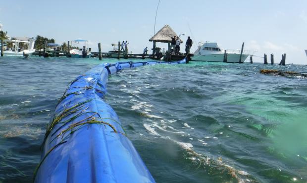 Dos mil 200 metros lineales de barreras marinas se instalan desde este 12 de mayo en Puerto Morelos como una medida para impedir que la macroalga conocida como sargazo llegue a las playas públicas.