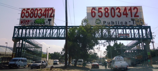 Los puentes peatonales construidos por el gobierno del Estado de México han servido para que los empresarios de espectaculares coloquen estructuras donde anuncian un número telefónico para ser rentados, lo cual hace suponer que el estado es quien permite el uso de ese tipo de anuncias que pueden ser peligrosos en tiempos de fuertes vientos o de algún sismo.