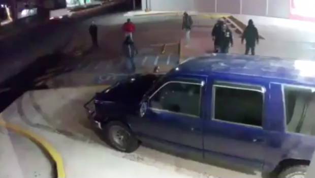 Fue la cámara de seguridad del banco que se ubica en la carretera México-Texcoco, que captó como una camioneta azul llega hasta el lugar con varios encapuchados que se bajan del auto.