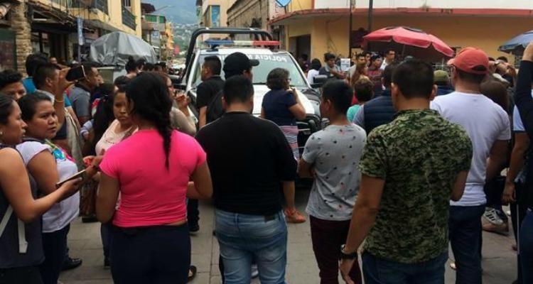 Los inconformes tiene retenidos a dos federales a bordo de una camioneta sin placas y a tres municipales en una patrulla, en la Calle Madero.