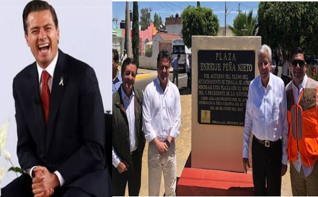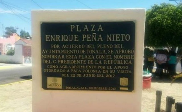 La plaza, ubicada en la colonia Ciudad Aztlán, cuenta con una placa donde se lee: “Plaza Enrique Peña Nieto. Por Acuerdo del pleno del Ayuntamiento de Tonalá se aprobó nombrar esta plaza con el nombre del C. presidente de la República como agradecimiento por el apoyo otorgado a esta colonia en su visita del 22 junio del 2017”.