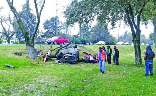 Con las llantas al cielo terminó un automo al volcarse y chocar contra árboles sobre carriles centrales de Paseo Tollocan. El conductor quedó tendido sobre el suelo hasta que llegaron paramédicos de la Cruz Roja para atenderlo y llevarlo al hospital.