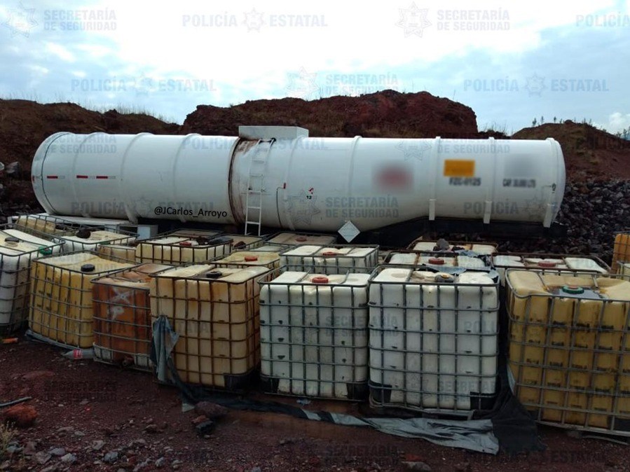 A un costado del autotanque, se encontraron 30 contenedores vacíos con capacidad de mil litros cada uno y cuatro camionetas desvalijadas; 2 de ellas marca GMC, tipo Van, color vino y azul y las otras dos de marca Chevrolet, una tipo expres color vino y la otra tipo pick up, color negro, así como también dos chasis con cabina de camiones desarmados.
