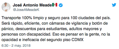 El candidato del Partido Revolucionario Institucional (PRI), José Antonio Meade, criticó el segundo piso y ofreció que de ganar la Presidencia implementará transporte cien por ciento limpio y seguro para 100 ciudades del país.