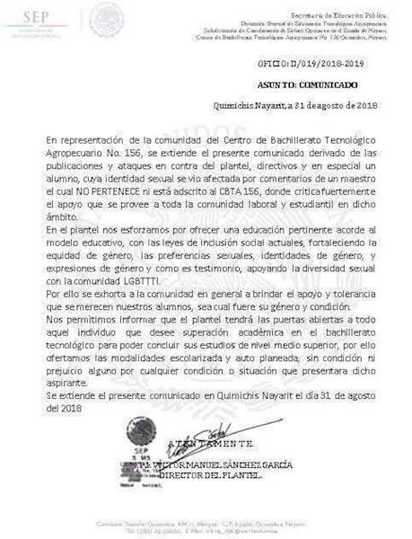 “Se exhorta a la comunidad general a brindar el apoyo y tolerancia que se merecen nuestros alumnos, sea cual fuere su género y su condición. El plantel tendrá las puertas abiertas a todo individuo que desee superación académica”, dice el documento.