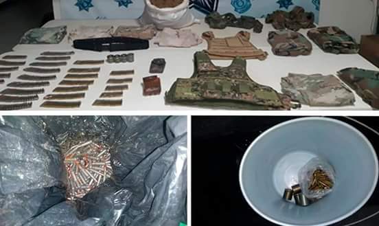 Camioneta Volkswagen, tipo pick up, color blanco, placas de circulación HE1307B, serie 9BWLB05U7GP074915, en el interior de la guantera se localizaron 15 cartuchos útiles calibre .223; 2 chalecos tácticos; 2 camisolas (una color verde pixelada y una color caqui); un pantalón color verde tipo militar y una fornitura también verde tipo militar. Camioneta Toyota, tipo pick up, color blanco, placas de circulación MY68289 del estado de Michoacán, serie JT4N81RXK0008534, en su interior se localizaron 20 cartuchos útiles calibre .223 mm. Jeep, tipo Grand Cherokee, color gris obscuro, modelo 2005, placas GNJ1215, serie 1J4HS58N15C686513, entre los asientos delanteros se localizaron 40 cartuchos útiles calibre .223mm y en el asiento trasero una fornitura verde pixeleada, una cubeta color verde en su interior contenía 234 cartuchos útiles calibre 7.62x39mm.