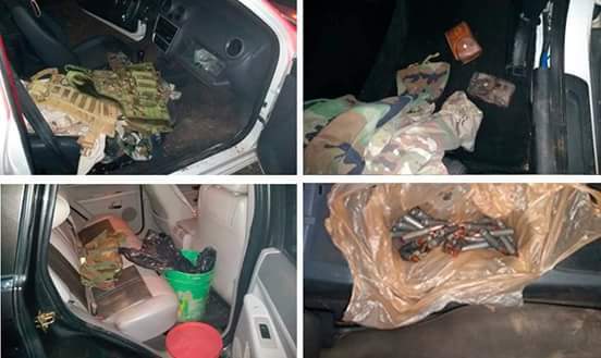 Camioneta Kia, tipo Sportage, modelo 2016, placas GZL682A del estado de Guerrero, serie U6YPC3AA3GL727582, en el asiento del copiloto se localizaron 3 pantalones, 2 verde tipo militar y uno color caqui y 2 cartucheras de cuero; en el asiento trasero, una cubeta blanca con 120 cartuchos útiles calibre .223mm; 4 casquillos de granada calibre 40 mm; una camisola y un pantalón color verde tipo militar. Nissan, tipo Frontier NP300, modelo 2016, color blanco, placas GY9144A de Guerrero, serie 3N6AD35CXGK819949, en el asiento del copiloto se localizaron 40 cartuchos útiles calibre 7.62x39mm. Ford, tipo F-150 pick up, modelo 2007, color negro, placas HE91547 de Guerrero, serie 1FTDX1865VKB14616, en la guantera se localizaron 20 cartuchos útiles calibre 7.62x39mm. Cuatrimoto marca Honda, serie 1HFTE314554004813, color verde con negro, en la parte posterior fue localizada una bolsa negra con 25 cartuchos útiles calibre .223mm.