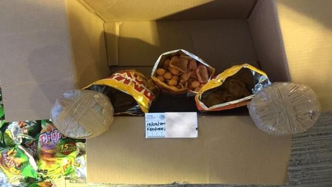 Los policías federales aseguraron un total de dos mil 310 paquetes circulares conteniendo el enervante y confeccionados con cinta canela, los cuales estaban distribuidos en mil 113 cajas con bolsas de frituras de maíz.