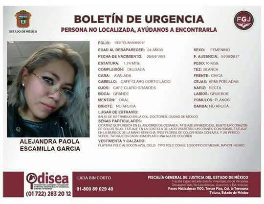 En una ficha de localización, el Centro de Apoyo de Personas Extraviadas y Ausentes (CAPEA), de la PGJ capitalina, solicita información para dar con el paradero de Alejandra Escamilla García, quien fue vista por última vez la tarde del viernes al salir de su lugar de trabajo.