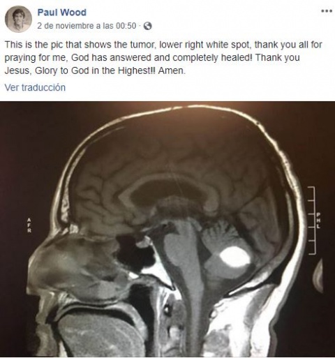 Si no crees en Dios y crees que no hace milagros, explica esto. El tumor desapareció y los médicos no puede explicarlo, están de acuerdo en que se trata de un milagro”, escribió Paul en su cuenta de Facebook, donde muestra una tomografía de su cabeza que le hicieron en el hospital.