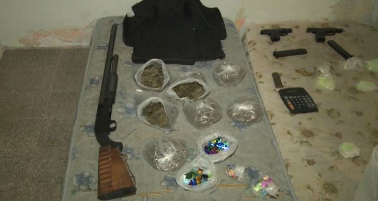 En el operativo policiaco realizado en villa Loyola se aseguraron 2 mil dosis de cocaína, mil de mariguana, tres pistolas, un revólver calibre .32 largo, una escopeta 12/70, dos chalecos antibalas con inscripción policial, una máquina selladora térmica y 18 mil pesos.