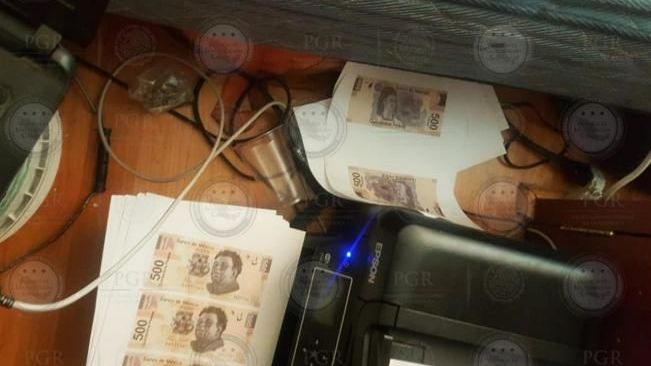 La PGR informó que derivado de trabajos de gabinete y campo, se supo que en los inmuebles se llevaba a cabo la falsificación de billetes de denominaciones de 100, 200, 500 y mil pesos.