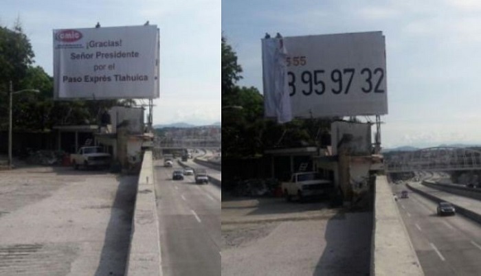 A una semana de que aparecieran en distintas carreteras del país mensajes de agradecimiento a Enrique Peña Nieto, y tras la tragedia ocurrida en el kilómetro 93 de la carretera 95D México-Acapulco, los espectaculares fueron retirados en el tramo del Paso Exprés.