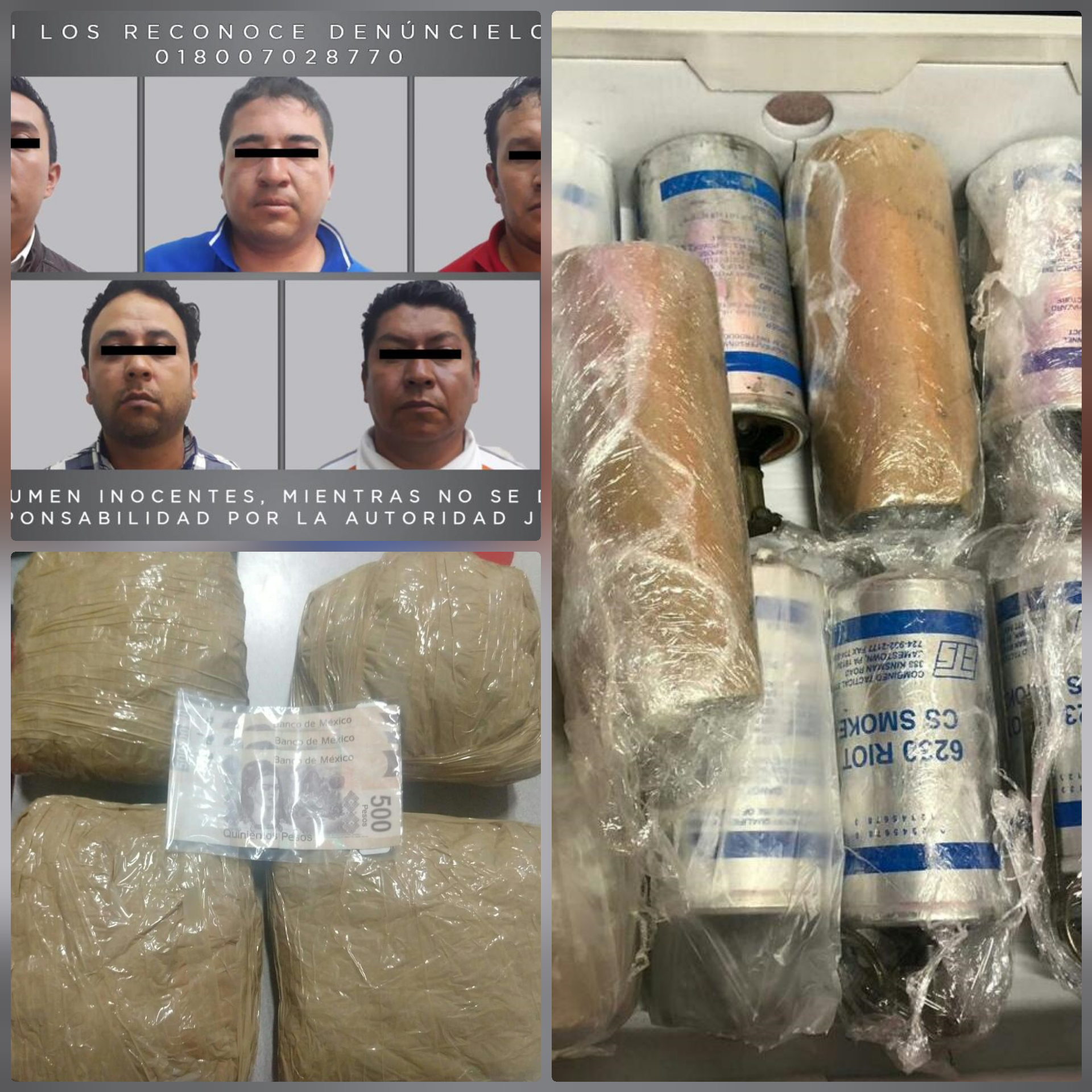 Por ello, los Policías de Investigación se aproximaron y detuvieron a estos cinco sujetos quienes llevaban consigo varios envoltorios con hierba verde con las características de la marihuana, además al hacer una revisión en el interior de la camioneta en la que viajaban fueron encontradas nueve granadas de gas lacrimógeno.