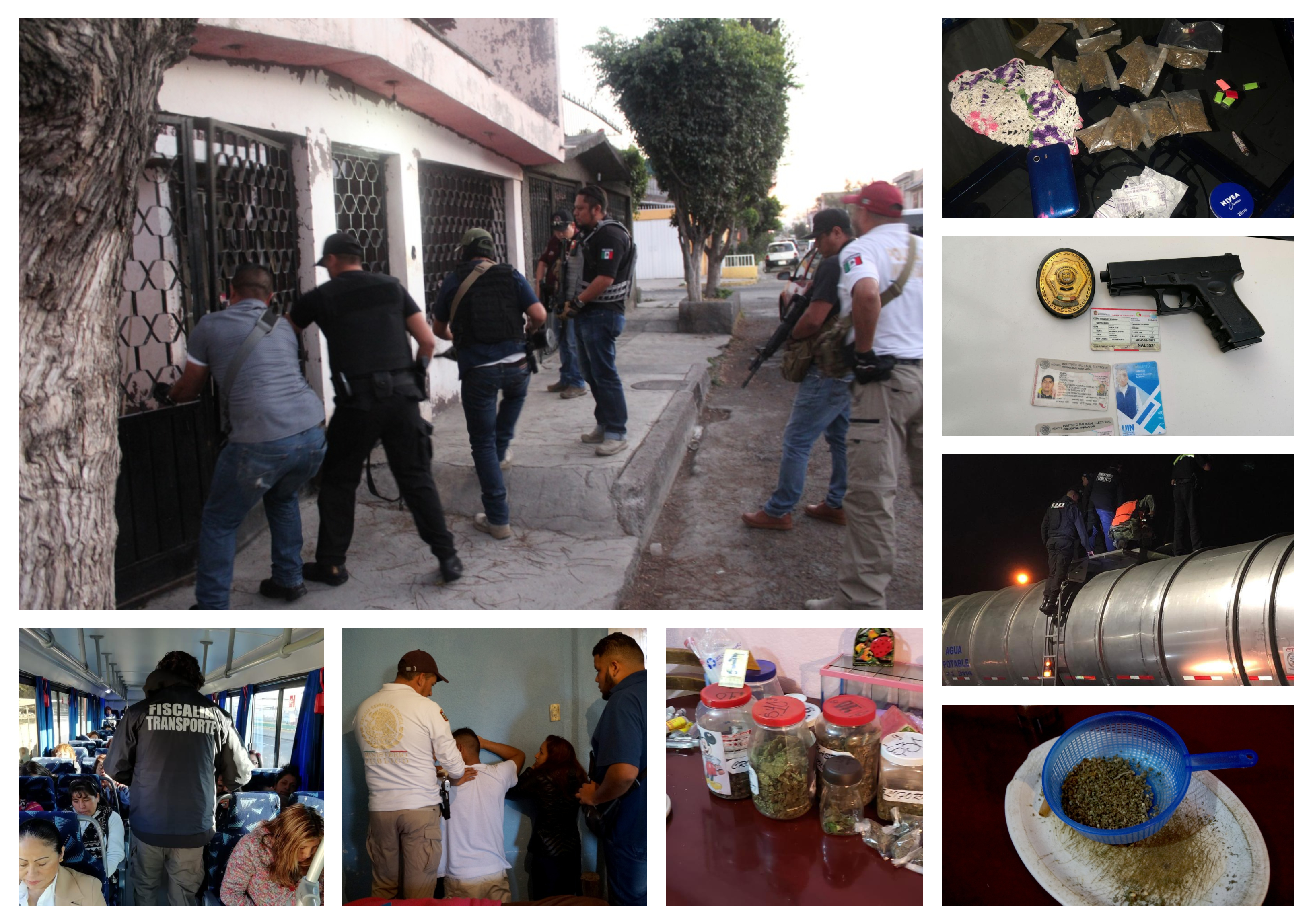 En total se realizaron 101 acciones operativas en 87 colonias, que constaron en cateos en domicilios identificados como puntos de venta de droga, revisión de unidades de transporte público, barridos en calles y células móviles de la Policía de Investigación, con un estado de fuerza cercano a los 1,200 elementos de las diversas corporaciones.